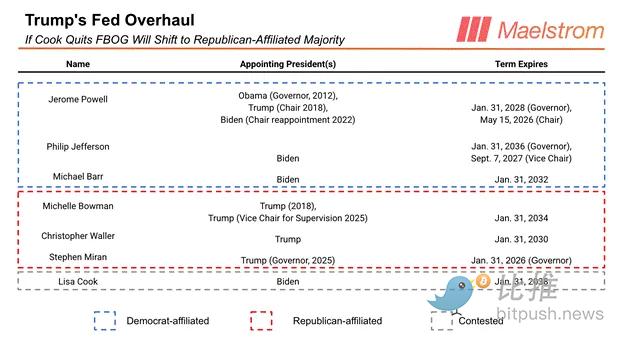 若特朗普在 FBOG 拿下四席多数,他就能迅速迫使 FOMC 按他的意志降息。那么,目前有多少理事效忠特朗普?