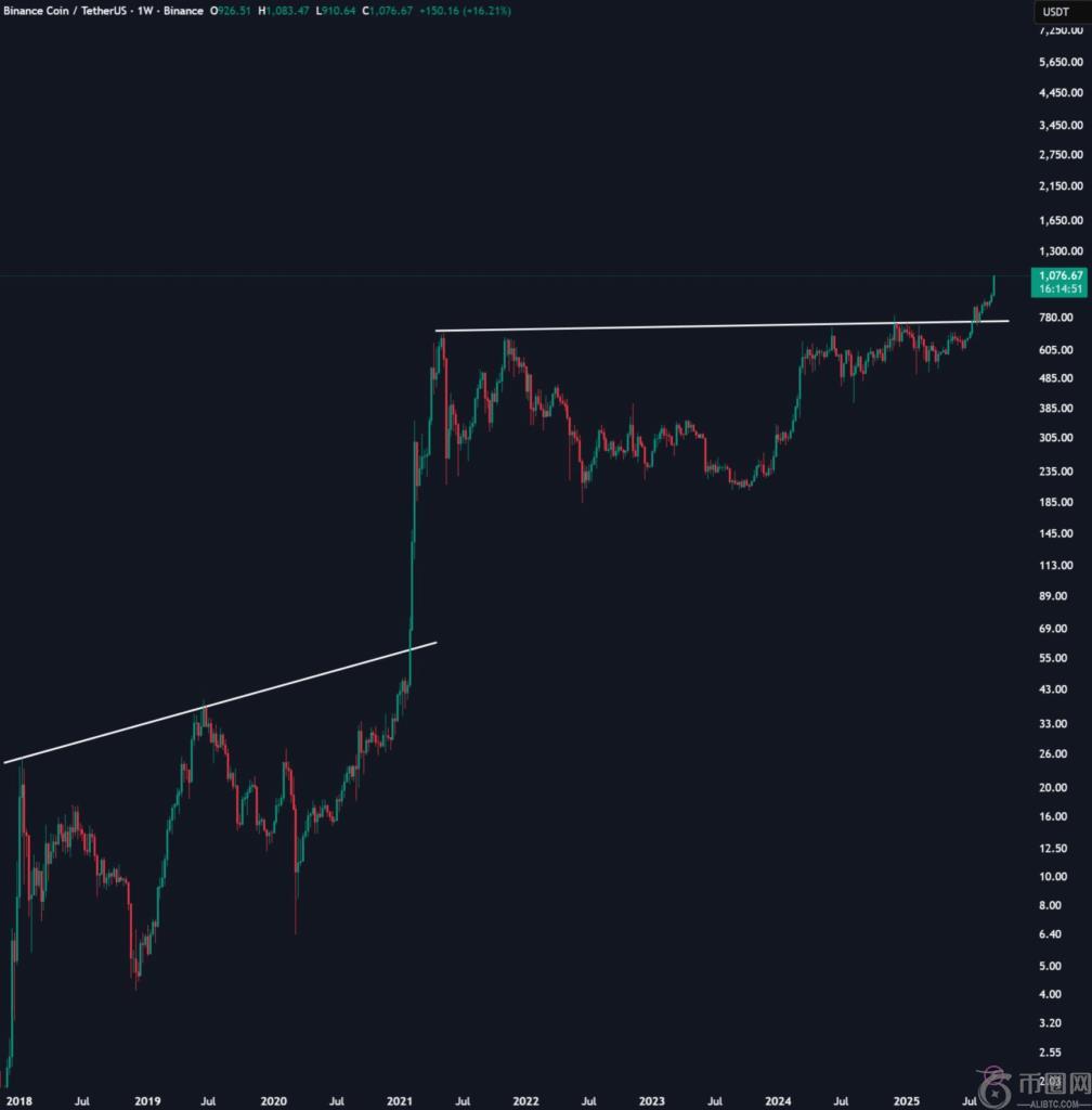 此外,币安币相对于其他主流币种的强劲表现也强化了这一论点。尽管许多仍在追寻历史高点,但 BNB 已然创下新高。