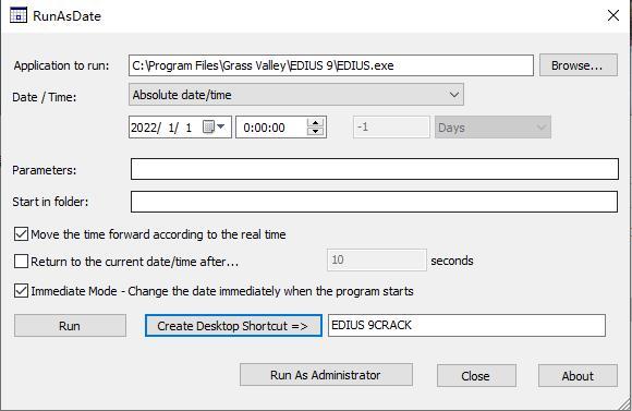 8、并且以管理员身份运行,首先选择安装目录文件EDIUS.exe,可随意设置到期时间,勾选”immediate mode -change”,最后点击Create Desktop Shortcut;
