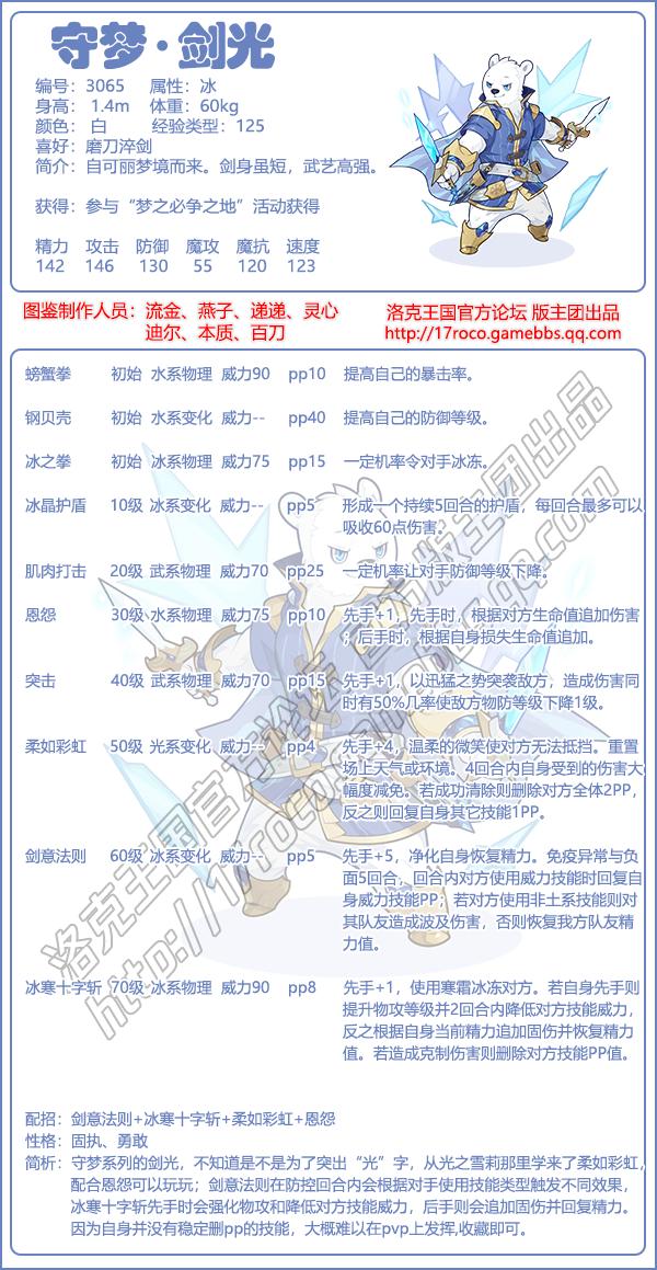 1、洛克王国守梦剑光技能配招:剑意法则+冰寒十字斩+柔如彩虹+恩怨