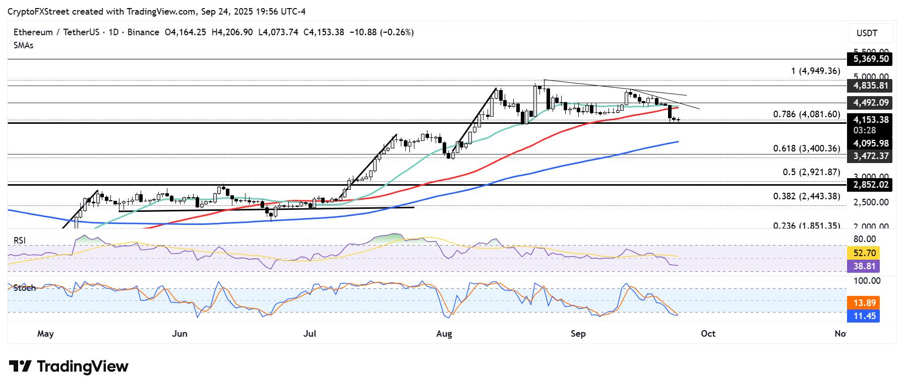 ETH 再次测试了 4,000 美元心理关口附近的支撑位,目前其价格持续低于 20 日和 50 日简单移动平均线 (SMA)。若跌破 4,000 美元,该顶级或将从 3,700 美元附近的 100 日移动平均线反弹。然而,若 ETH 重新站上 4,500 美元关口,则可能触及 8 月 24 日创下的历史高点阻力位。