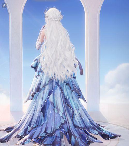 「蝶屿风袭」以蓝白色调为主,裙身布满立体蝴蝶纹路与半透明羽翼装饰,行走时裙摆随动作轻扬,仿佛蝴蝶振翅。头部搭配的蝴蝶发箍与发间点缀的珍珠,强化了整体造型的轻盈感。更值得关注的是其动态特效:当玩家触发舞蹈动作【蝶引翩翩】时,角色周身会浮现金色光晕,伴随蝴蝶粒子特效盘旋,营造出“人蝶合一”的梦幻场景。