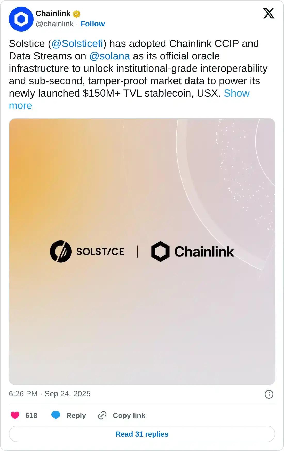 周三,合成稳定币和收益生成协议 Solstice Finance 宣布与 Chainlink、Ceffu、Copper 和 Arcanum 建立战略合作,旨在加强 Solstice 的基础设施、跨链兼容性、结算机会和市场覆盖范围。