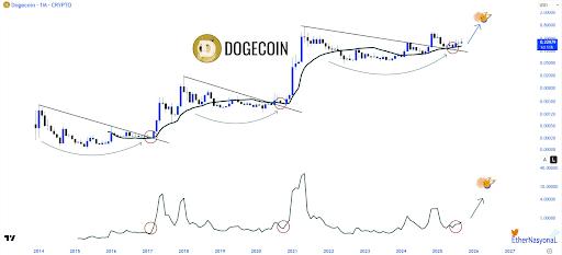 狗狗币尚未在当前市场周期中出现许多人预期的那种反弹,但一位分析师认为,这只是时间问题。这位名为@EtherNasyonaL的分析师在社交平台X上发帖称,狗狗币的抛物线走势不可避免,并指出了狗狗币在2017年和2021年爆发性上涨之前的反复出现的图表结构。
