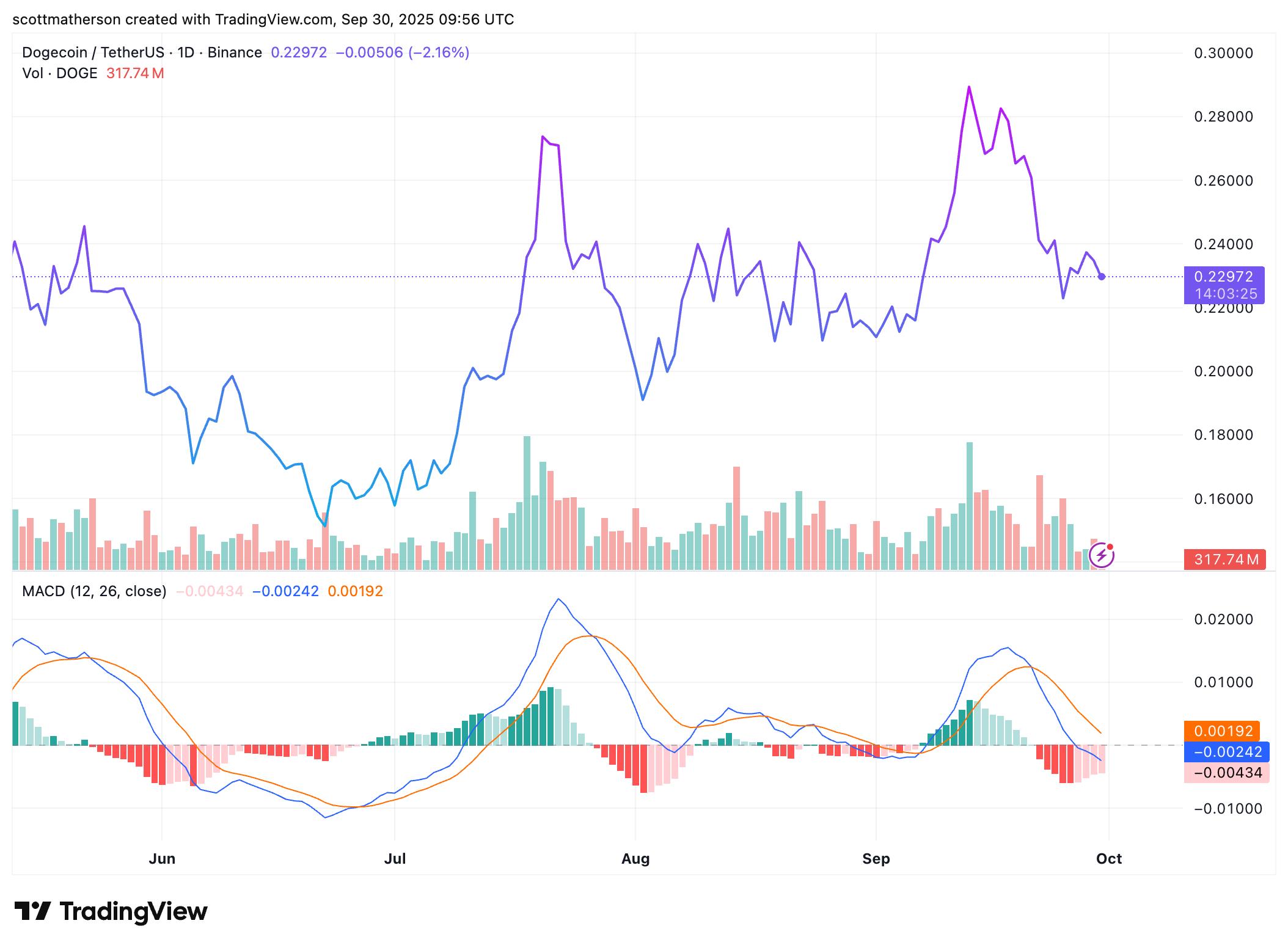 尽管如此,狗狗币的链上数据和交易指标已经开始反映出与过去突破前出现的积累阶段一致的行为。尤其是9月份多次购买鲸鱼股票尤为突出。例如,DOGE鲸鱼新增20.8亿DOGE在最近一次价格回落至 0.23 美元以下时,他们的持股量有所下降。