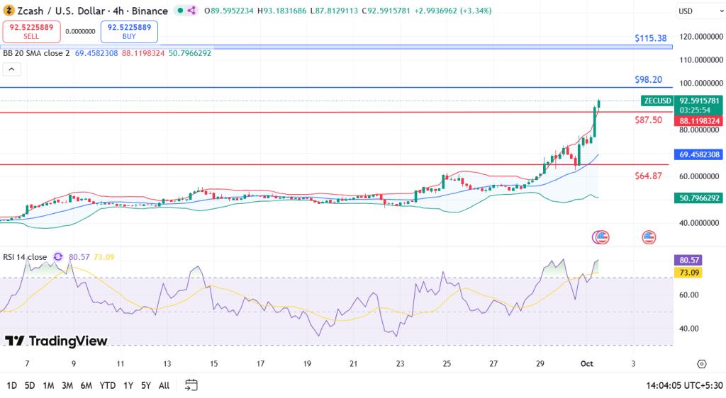 ZEC 价格在 24 小时内暴涨 30.8%,达到 89 美元以上的数月高点。