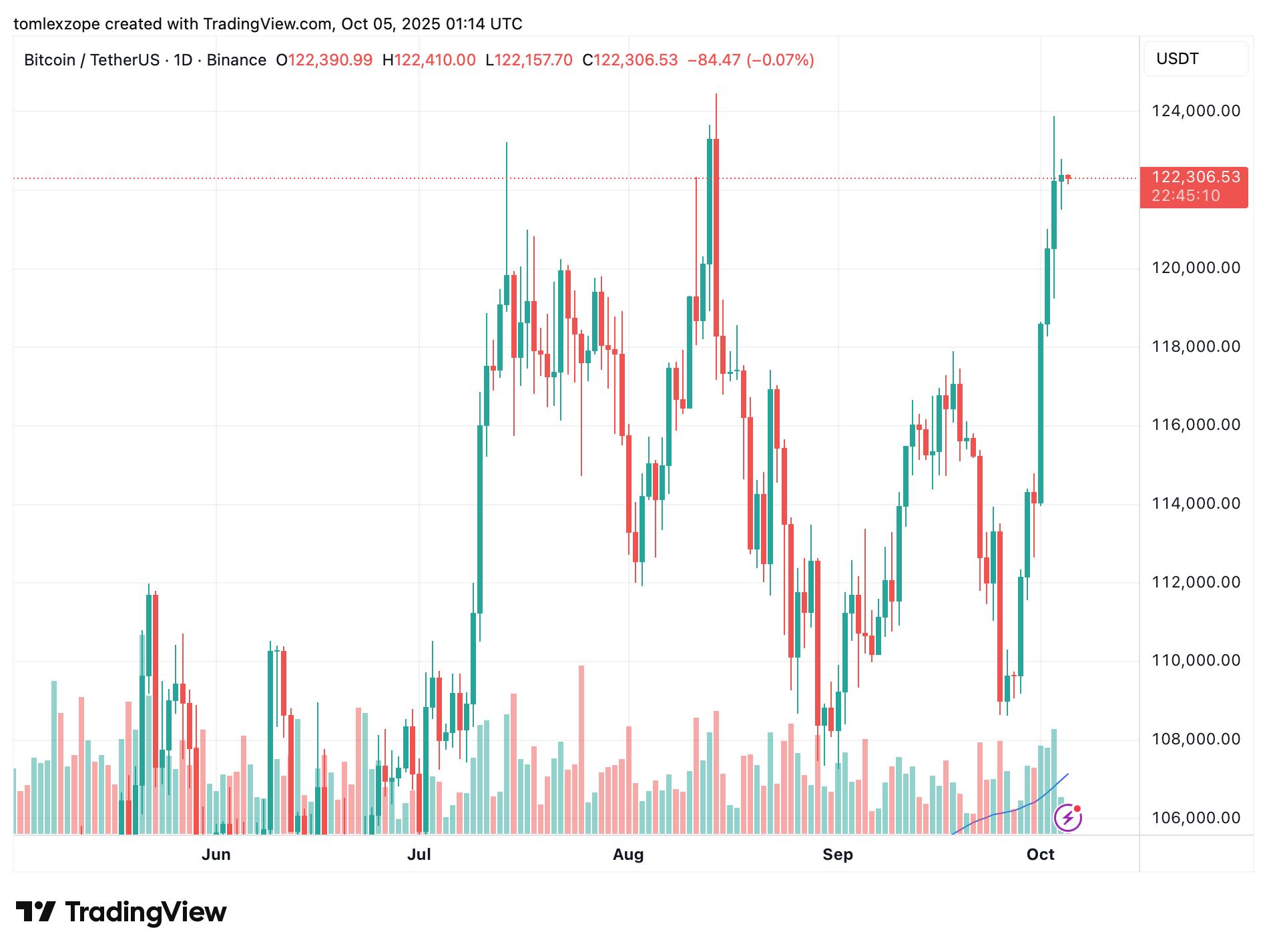 截至本文撰写时,BTC 的价值约为 122,345 美元,过去 24 小时内价格没有出现显著波动。尽管这一旗舰加密货币在过去一天的涨幅似乎有所放缓,但在周线图上,它仍然保持着令人印象深刻的记录。根据 CoinGecko 的数据,比特币的价格在过去七天内上涨了近 12%。