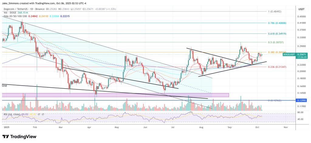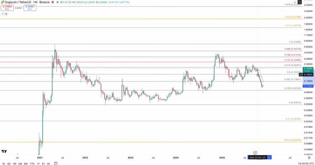 10 月 5 日视频Mattsby 将从 2021 年峰值到 2022 年周期低点(标记为 0.26261 美元)的 0.618 回撤位视为“价格仍在被拒绝”的直接触发因素,并补充道:“这是值得关注的区域,可能试图在该区域上方收盘。” 他每周的 DOGE/USDT 图表截图显示,在记录时,价格徘徊在 0.248 美元至 0.249 美元之间,盘中高点接近 0.265 美元,低点接近 0.226 美元,突显出市场在未确定决定性收盘的情况下反复测试了区间。