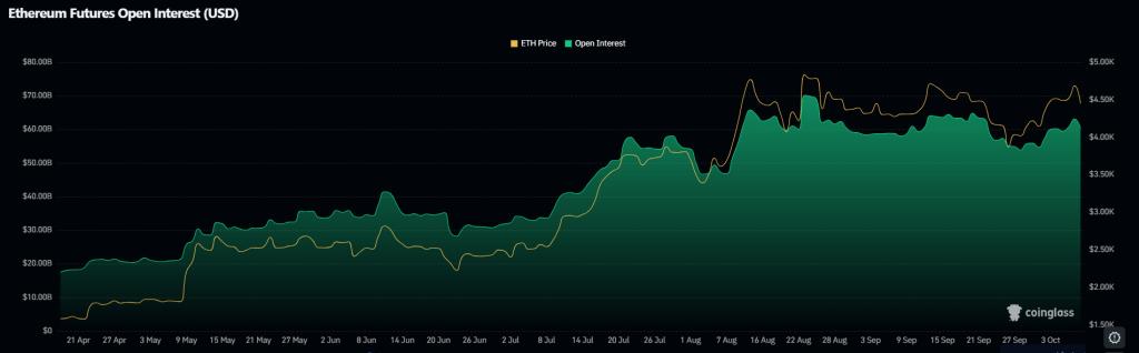 根据 SoSoValue 的数据,仅 10 月份,在美国上市的现货以太坊 ETF 就实现了 6.214 亿美元的净流入,是 9 月份 2.857 亿美元的两倍多。此外,以太坊的未平仓合约持续飙升,上周该指标从 540 亿美元的低点升至 600 多亿美元。这表明,尽管以太坊出现下行回调,但交易活动仍在持续增加,预示着可能出现反弹。