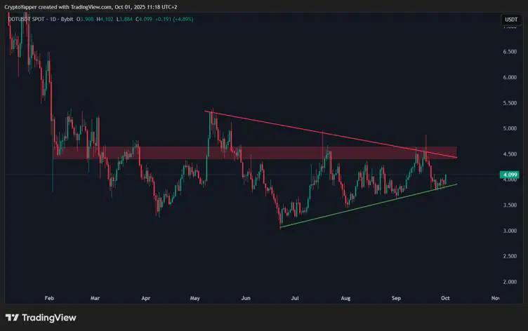 尽管Polkadot的愿景令人期待,但目前其价格仍处于窄幅波动区间。DOT当前交易价格接近4.10美元,阻力位在4.20美元附近,支撑位则位于3.80美元左右。社交媒体上的讨论进一步加剧了市场情绪,一位交易员因意外大额买入DOT而引发热议,他分享的图表显示,如果价格成功突破,DOT可能迎来高达1000%的涨幅。
