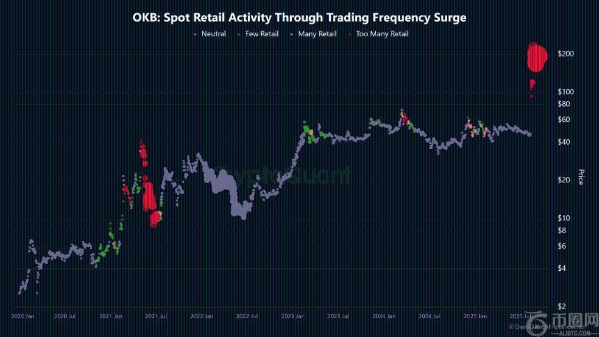 CryptoQuant 提供的现货零售活动数据显示,当前交易价格下,零售订单的累积量显著增加,表明市场对 OKB 的看涨潜力重新燃起了信心。