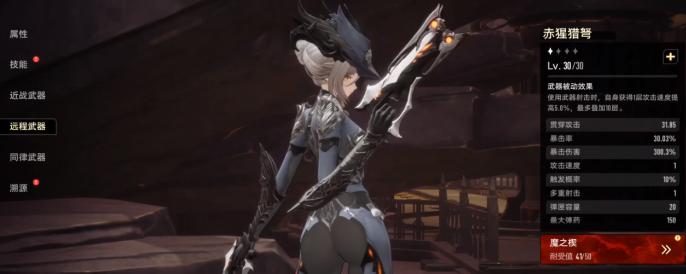 接着还可以来看一下属性,这把武器的贯穿攻击就可以直接达到31.85。如果在游戏中遇到了扎堆的敌人,那就可以轻松的完成穿透输出,完全不需要害怕小怪的围堵。还有30.03%的暴击率以及300.03%的暴击伤害。在叠加完攻击速度之后,暴击频率就会迅速的上涨,伤害也可以迅速的起飞,难怪在游戏中又被大家称之为射击速度的王者。