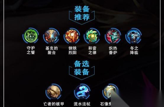 1、出装顺序:守护之誓+基克的聚合+钢铁烈阳+和音之旅+炽热香炉+冬之降临