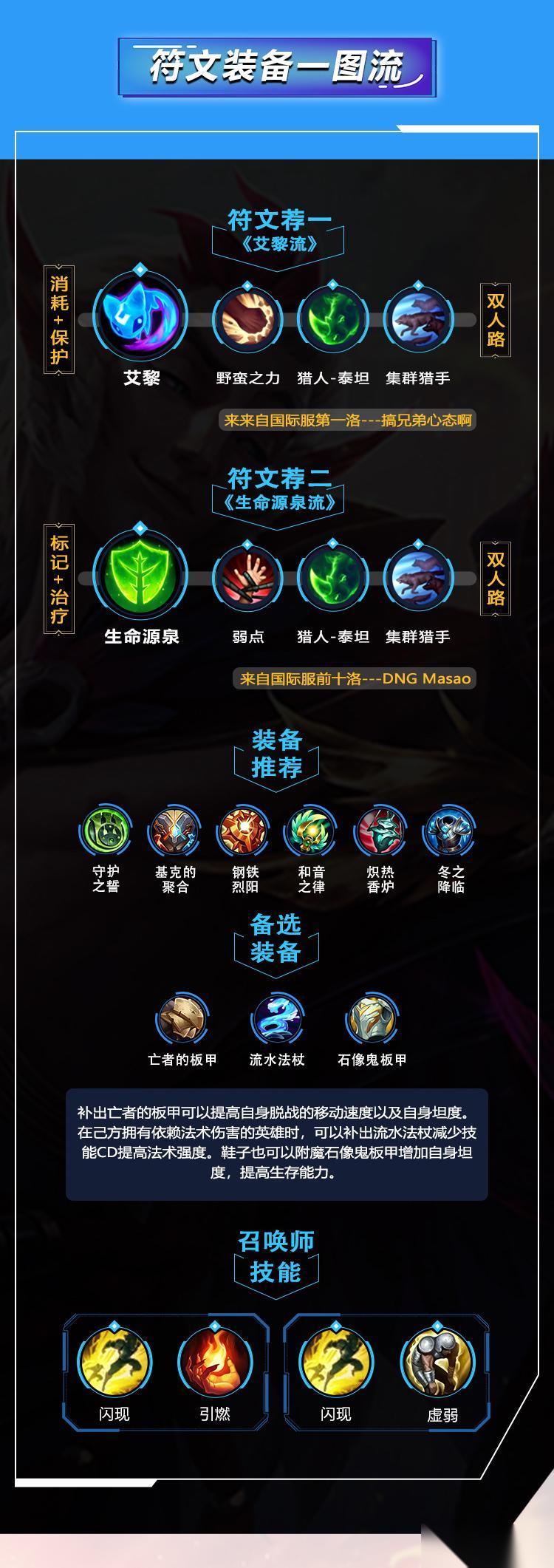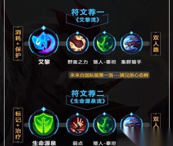 3、洛符文分析:洛艾黎符文,可以提高艾黎的保护能力和恢复能力;生命源泉流可以让洛更好的进行治疗和标记;