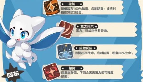 阿布属于攻防兼备型宠物,基础属性均衡,技能体系覆盖输出、控制与防御。虽然后期成长潜力有限,但在资源紧张的开荒阶段,阿布能为玩家提供稳定战斗支撑,是非常值得培养的早期核心宠物。