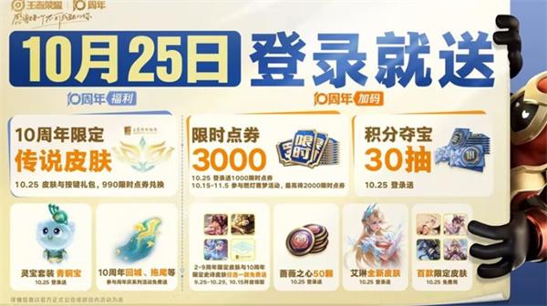 昨天第二篇推文带来10月25日十周年庆福利预告:送3000限时____、积分夺宝30抽,十周年限定传说皮肤等福利。