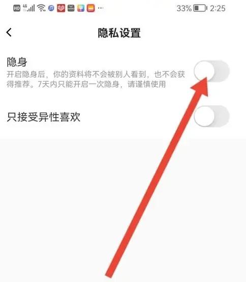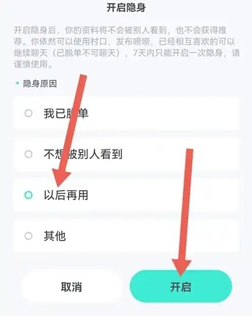 弹出下面的界面,然后选择隐身原因,再点击【开启】即可。