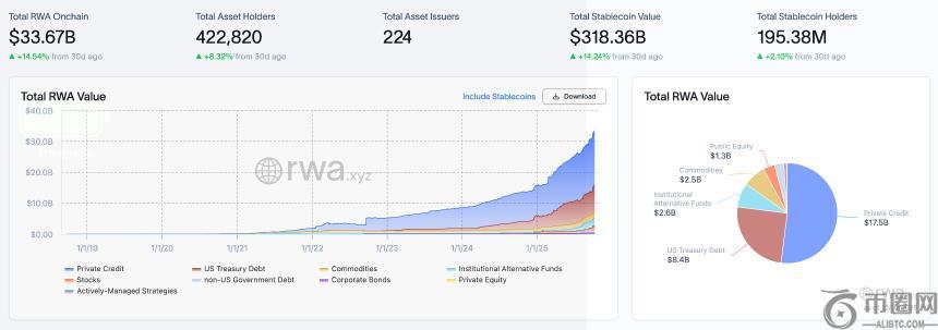 综合来看,本周期 RWA 市场呈现出“放量上行+结构扩容”的双重特征。一方面,总市值大幅跃升,叠加稳定币同步暴涨近 300 亿美元,表明新增流动性显著;另一方面,用户活跃度与资产发行人均实现同步增长,平台生态活力持续增强。资产结构层面,美国国债与商品类资产成为本轮上升主引擎,信贷占比虽略降但绝对体量仍最大,显示风险偏好提升背景下,市场正进行“再配置”与“再平衡”。市场风格正在由“信贷主导的高安全边际”过渡至“债权+商品+另类资产”多元并行的阶段,特别是公开股权品类的出现,可能预示链上 RWA 逐步承接二级资本市场逻辑的能力增强,向着更复杂的结构性金融演化。