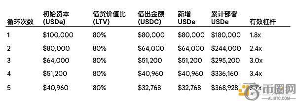 为了更直观地展示这一机制的杠杆效应,以下是以10万美元初始资本为例的循环借贷模拟过程(假设LTV为80%):