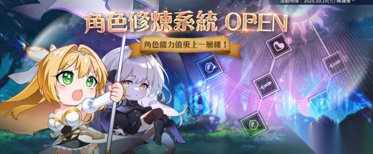 全新「角色修炼系统」开启,只要角色等级达 100 以上即可于游戏中「角色」→「修炼」中,使用所需财货资源 (灵魂、属性石) 即可进行角色修炼,提升角色能力值。
