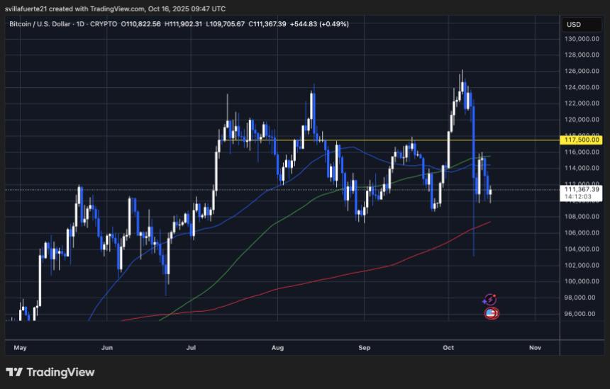 比特币继续徘徊在111,300美元左右,在上周暴跌至103,000美元附近后,显示出韧性。图表显示,BTC目前正在11万美元支撑位上方盘整,这一关键区域在过去的回调中曾多次充当短期底部。