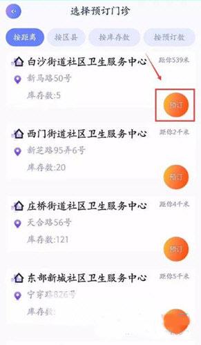 4、可按距离/库存数/预订数选择相关接种门诊→点击预约。