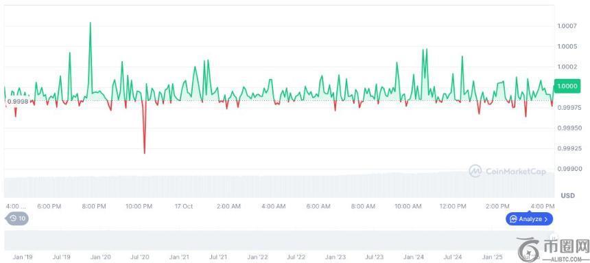 根据 CoinMarketCap 的数据,USDC(USDC)价格保持稳定,当前价格为 1.00 美元,市值达到 759.8 亿美元。尽管近期交易量和价格略有波动,但其在加密货币领域的主导地位依然稳固。