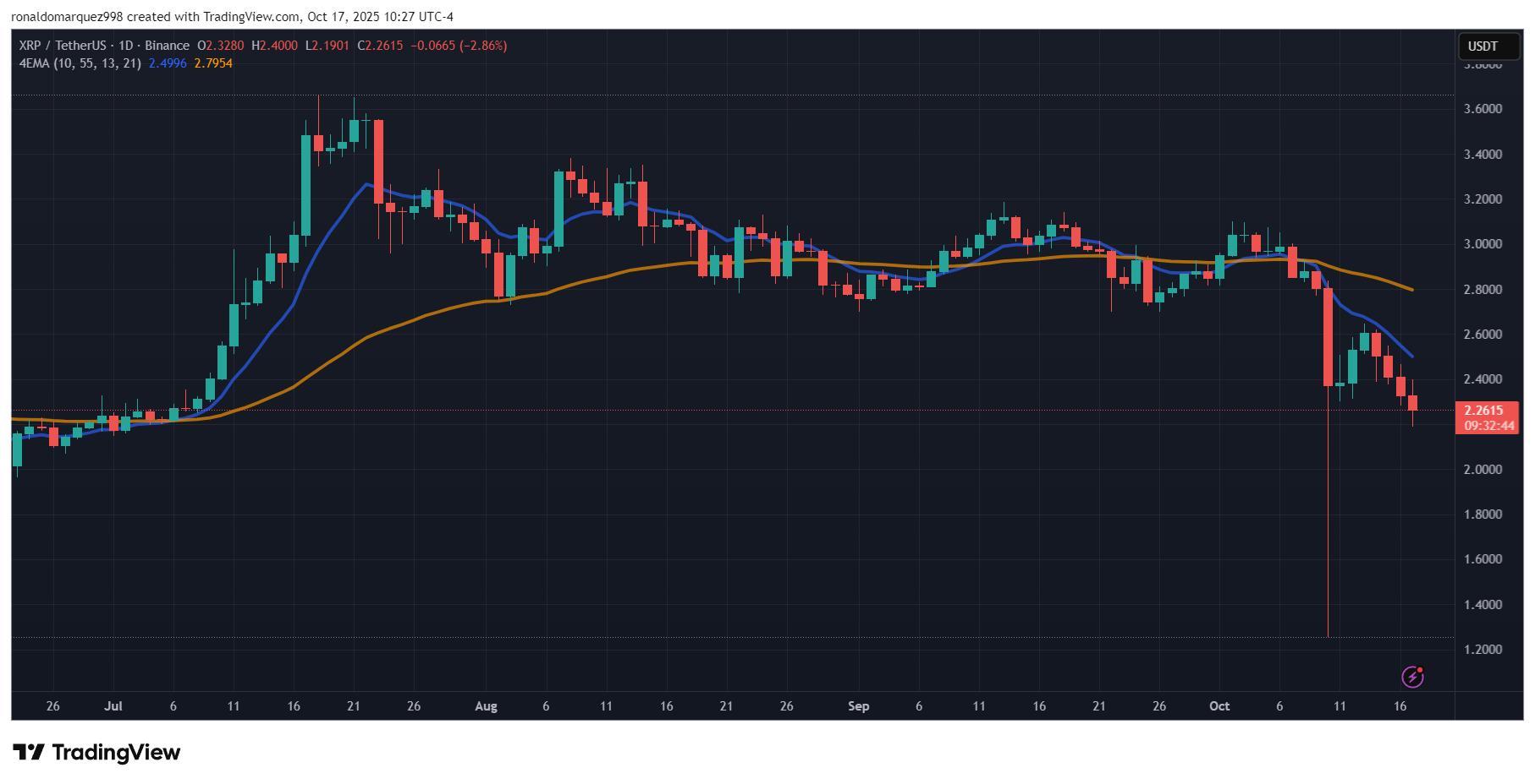 截至本文撰写时,XRP 交易价格约为 2.26 美元,在十月即将结束之际,处于关键支撑位。如果该水平跌破,且 2.4 美元的支撑位未能阻止 XRP 进一步下跌,XRP 可能会回落至 10 月 10 日市场崩盘期间触及的 1.2 美元水平。