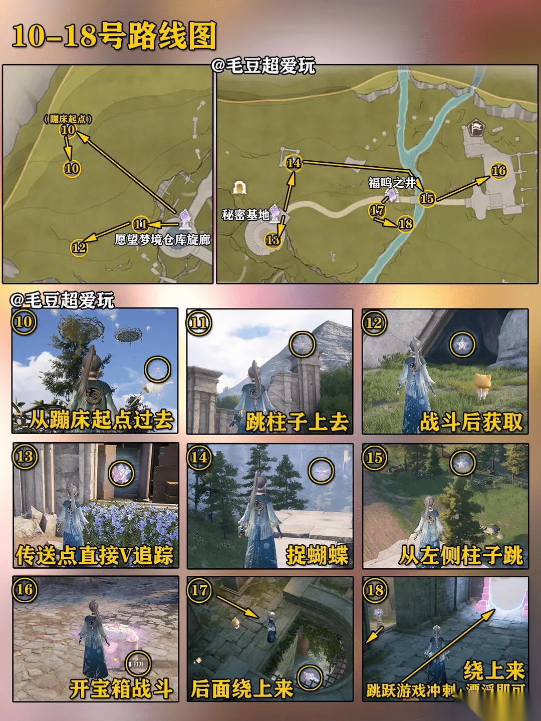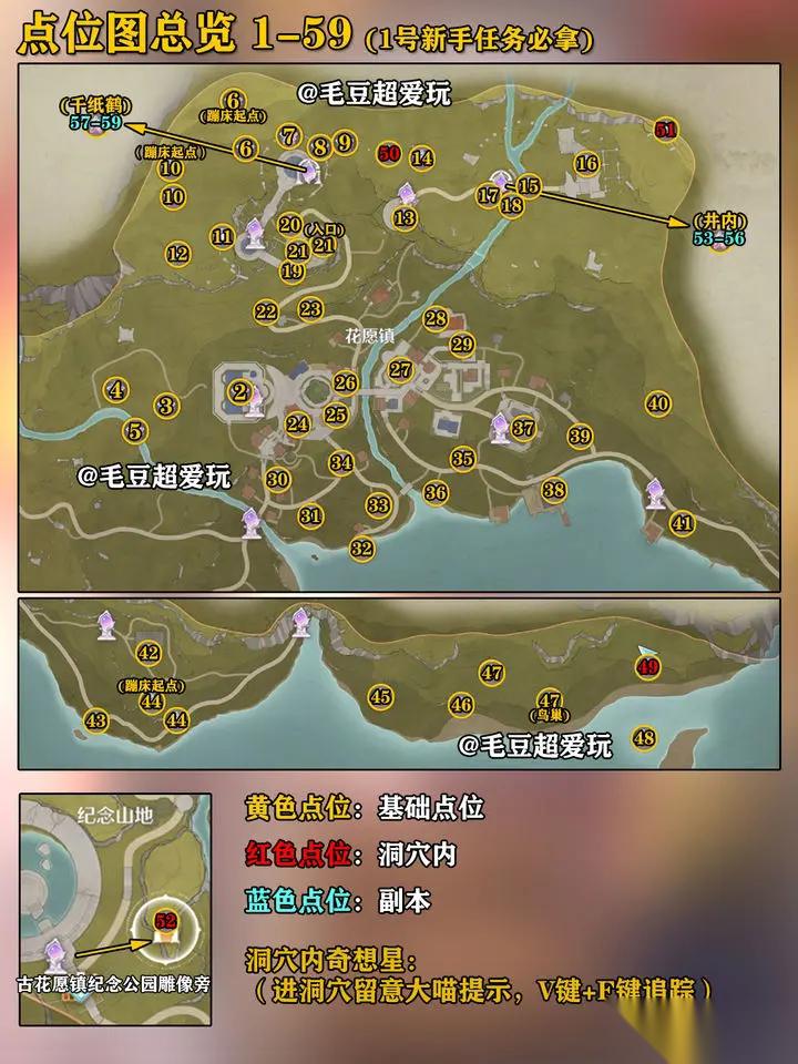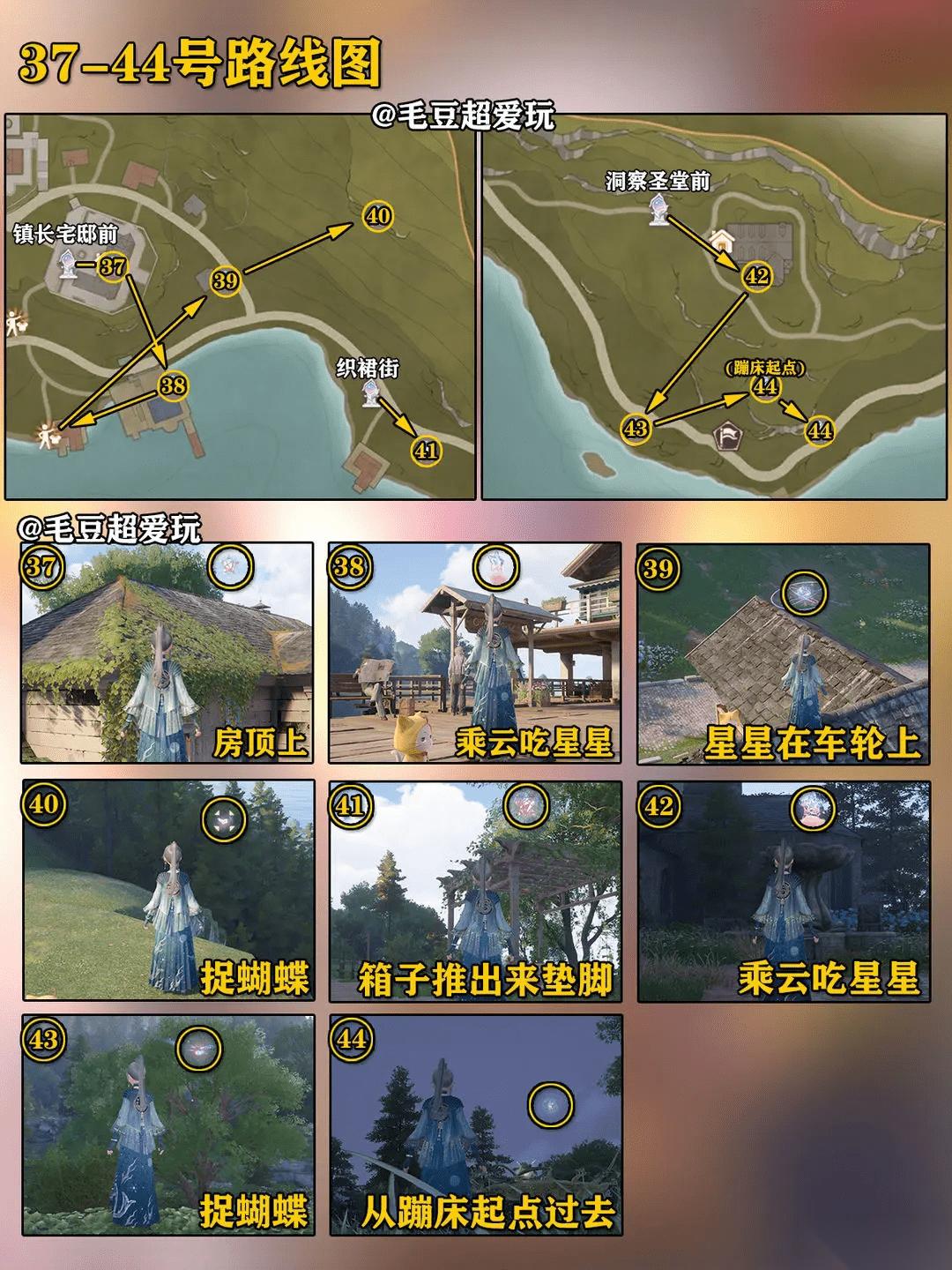 本篇共计包含1-48号奇想星的详细路线,49-52号在洞穴内,利用大喵视野和追踪不难拿。53-59号分别在《福鸣之井》和《愿望梦境仓库天台》副本内,副本内容多为跳跃,也不过多赘述。