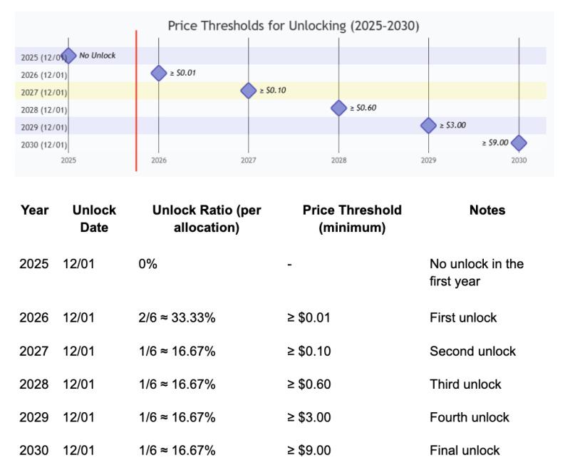 除社区空投部分外,所有其他分配–包括团队、基金会、Jackson AI 和 Sharkz Hub–受双重解锁机制约束,需要同时满足时间和价格条件。