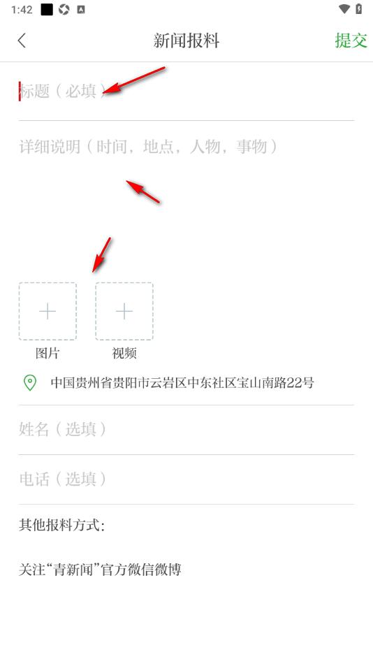 4.该软件会自动的定位自己所在的位置,之后填写好姓名以及电话信息,点击上方的【提交】按钮即可发布报料。