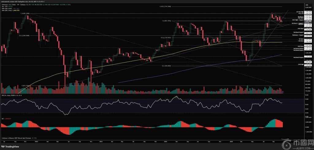 为了确认冲动性上涨,他标记了趋势线突破、以最高价 (ATH) 为基准的成交量加权平均价格 (VWAP) 转为支撑位以及相对强弱指标 (RSI) 状态转变:“如果我们突破趋势线,价格将最高价 (ATH) 成交量加权平均价格 (VWAP) 转为支撑位,且每日相对强弱指标 (RSI) 超过 50,我预计价格将迅速上涨至 4,950 美元,然后在 11 月发现价格。”每日价格失效反映了每周价格的逻辑:如果 4,093 美元成为阻力位,市场跌破 3,700 美元,然后收于其下方,那么在他看来,“我们绝对会重新测试年度开盘价”。