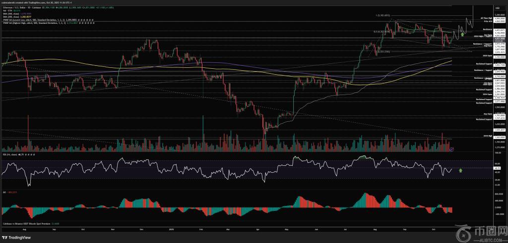 在 10 月 10 日的市场更新中,技术分析师 Nik Patel (@OstiumLabs) 认为,以太坊正接近一个成败攸关的区域,接下来的几个交易日将决定其涨势是继续,还是进一步回落。鉴于 ETH 现货价格在 4,000 美元左右,Patel 将他的论点锚定在 ETH/USD 和 ETH/BTC 的收复和失效水平的紧密结合上,并强调较低时间框架的行为必须与较高时间框架的结构保持一致,才能保持看涨路径的畅通。