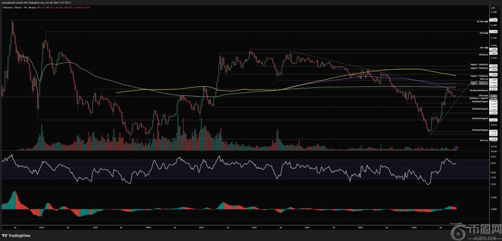 ETH/BTC 每日走势图将这些信号提炼为可操作的水平。价格“在 0.0319 和年度开盘价之间触及低点,随后强劲反弹并收复 0.036 支撑位”。理想情况下,0.036 现在充当跳板;如果不是,Patel 认为“在 0.0319 水平上方出现更高低点,然后继续走高”。
