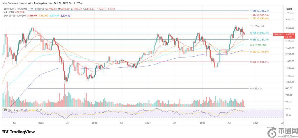 他将周线失效点设在 3,700 美元,并警告称,如果收盘价跌破 3,700 美元,则年线开盘价将被视为看涨结构的“最后支撑位”;跌破 3,700 美元则面临“更大幅度回调至 2,850 美元”的风险。Patel 的基本预测仍然乐观:“如果下周金价能回升至 4,093 美元上方,10 月份收盘价能突破 4,400 美元,则将导致突破 5,000 美元新高11 月初,对于 ETH 来说这是一个非常强劲的月份。”