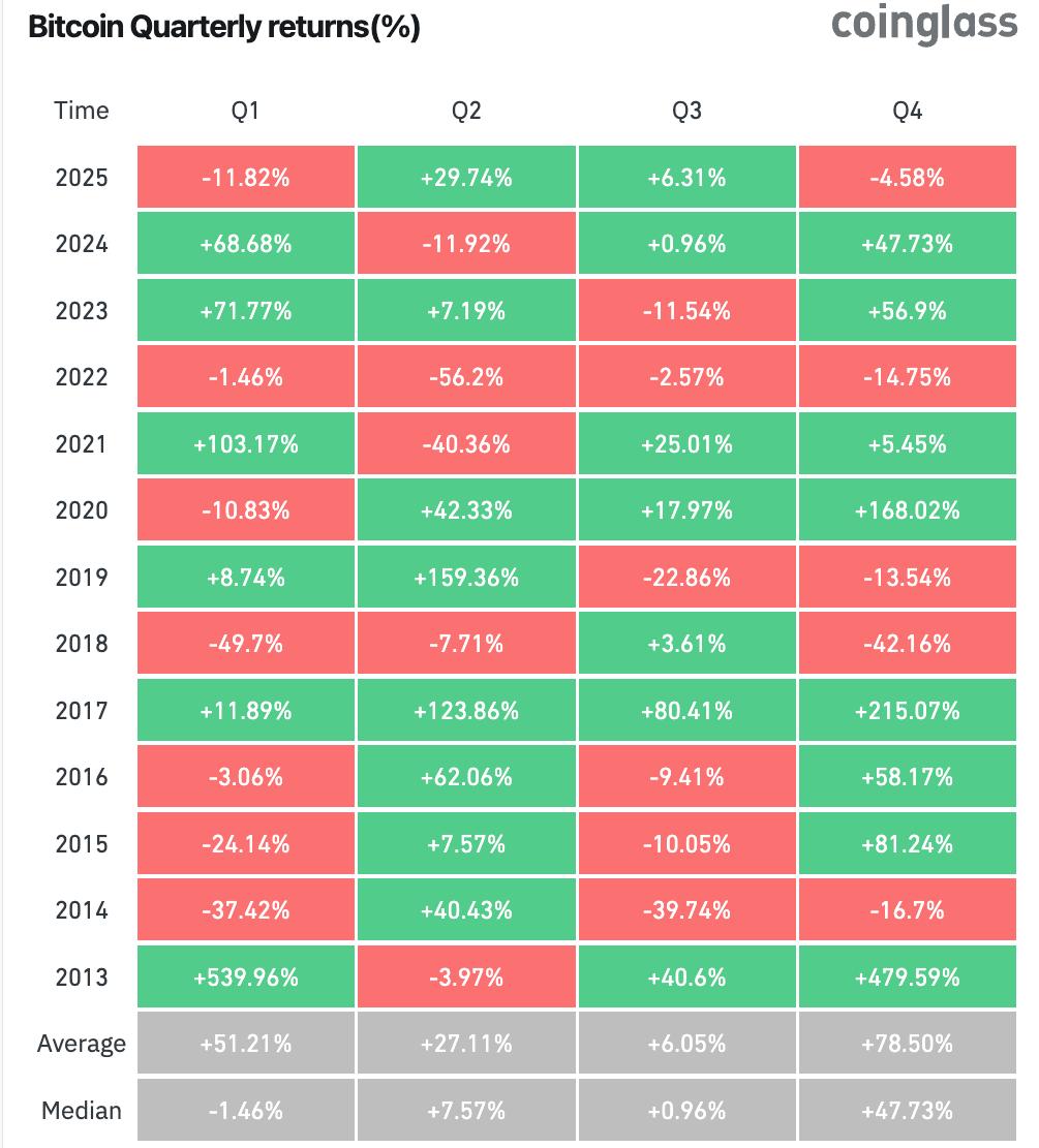 根据 CoinGlass 的数据,第四季度是比特币历史上表现最强劲的季度,平均回报率为 78.49%。