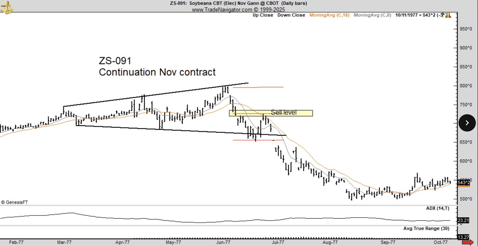 Peter Brandt 引用了 1977 年的大豆价格走势图,指出了其与比特币当前价格走势图的相似之处。资料:Peter Brandt