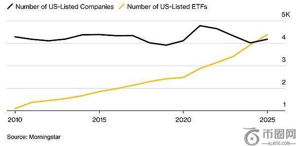 现在有超过 4300 只交易所交易基金,而公开交易的公司大约只有 4200 家。ETF 占所有投资工具的约 25%,十年前这一比例为 9%。市场历史上首次出现了基金数量超过实际股票数量的情况。