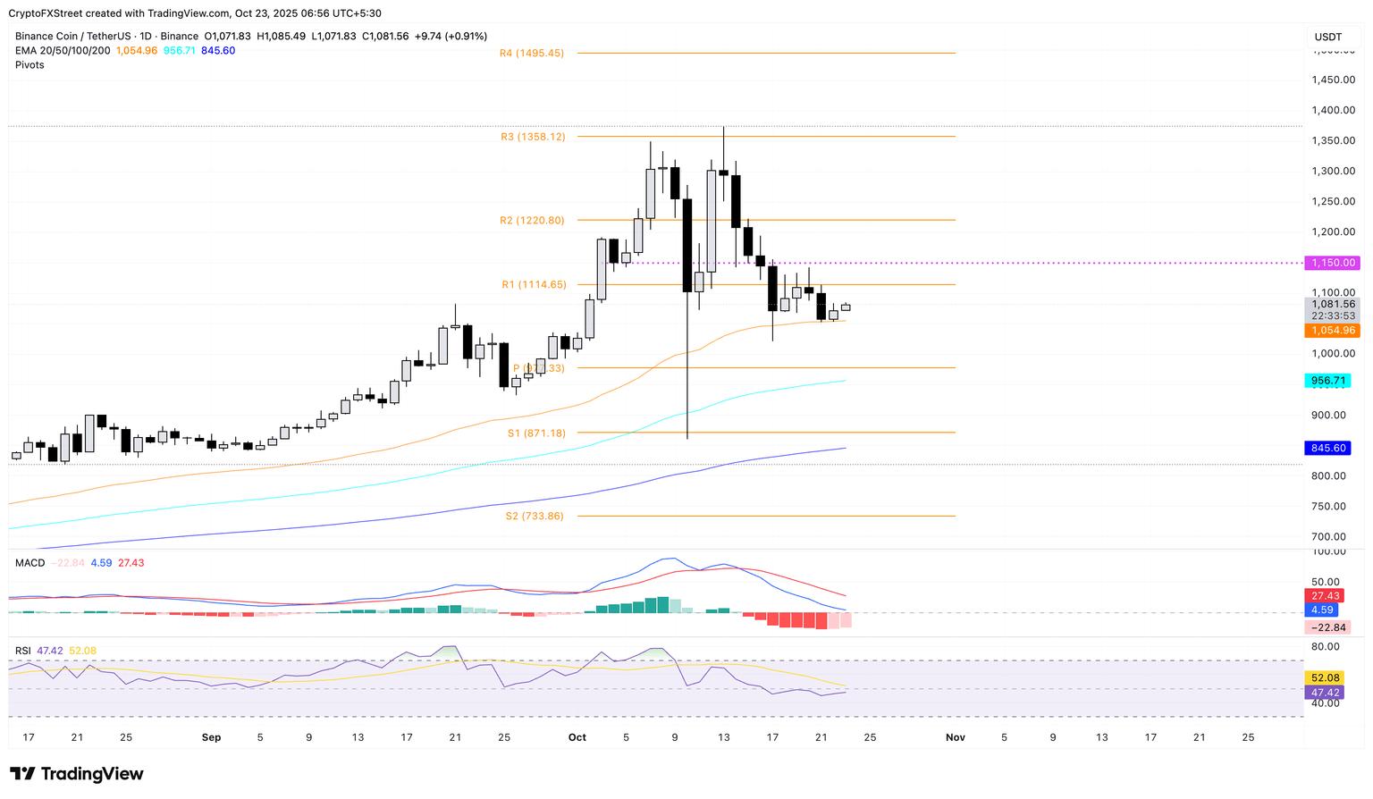 如果 BNB 跌破 50 天 EMA,则其复苏势头将失效,并有可能跌至中心枢轴点 977 美元。