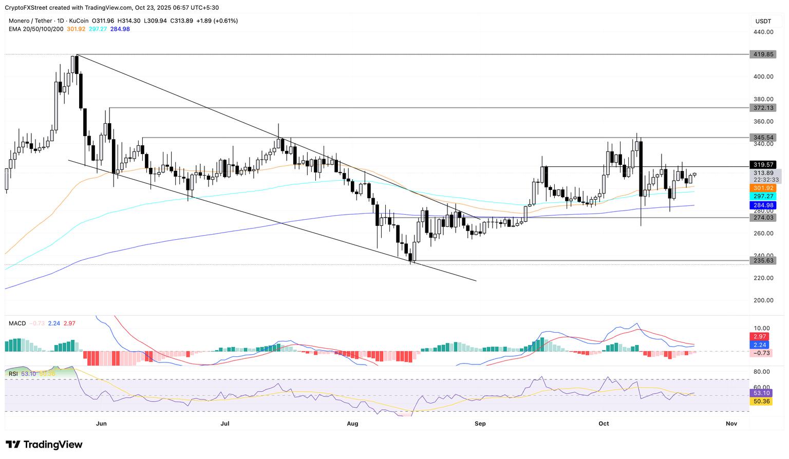 如果 XMR 从 319 美元反转,它可能会重新测试 50 天 EMA 302 美元,然后分别测试 100 天和 200 天 EMA 297 美元和 285 美元。