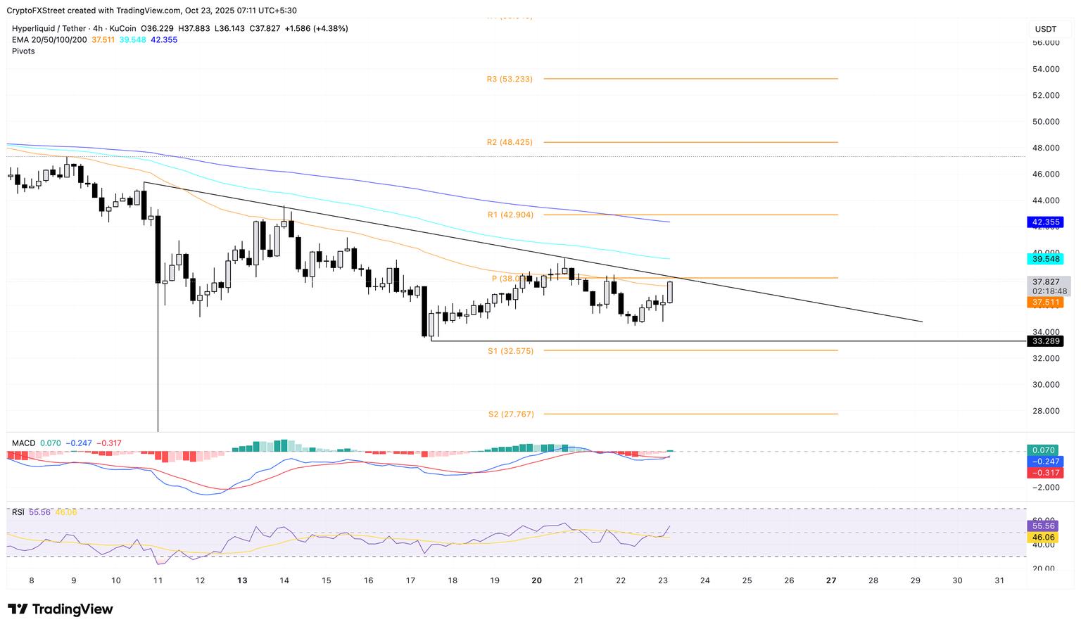 截至周四发稿时,Hyperliquid 上涨逾 4%,延续了前一日 2% 的涨幅。这款专注于永续合约的去中心化交易所 (DEX) 代币的反弹势头已接近局部阻力位趋势线,并完成了一个下降三角形形态,4 小时图上周五的低点 33.28 美元为基点。