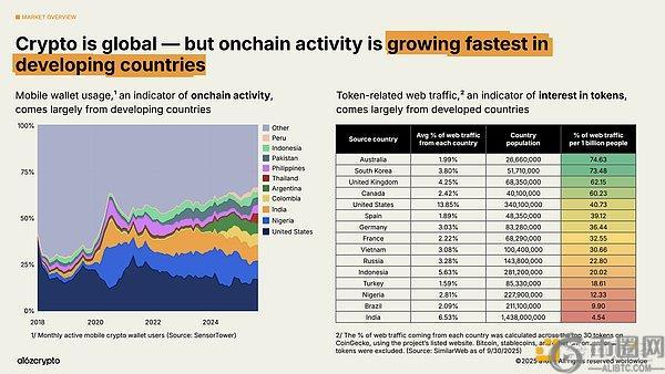 加密生态具有全球性特征,但世界不同地区呈现出差异化使用模式。作为链上活动指标的移动钱包使用量,在阿根廷、哥伦比亚、印度和尼日利亚等新兴市场增长最快(特别是阿根廷在过去三年货币危机持续升级的背景下,加密移动钱包使用量激增16倍)。