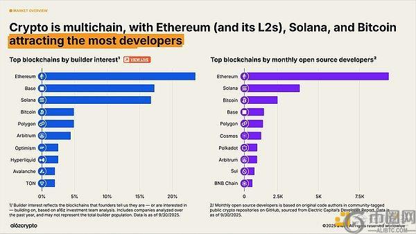 从开发者生态来看,加密世界仍呈现多链格局,比特币、以太坊及其二层网络、Solana构成三大核心开发者聚集地。2025年以太坊及其二层网络成为新开发者的首选目标,而Solana则是增长最快的生态之一——过去两年开发者兴趣增幅达78%。这一数据源自a16z加密投资团队对创业者首选开发平台的调研分析。