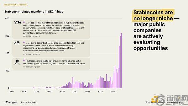 数月后,Circle的百亿美元IPO标志着稳定币发行商正式跻身主流金融机构行列。而7月两党共同支持的《GENIUS法案》正式立法,为建设者与机构提供了清晰的行动指南。此后SEC文件中提及稳定coin的频率增长64%,各大金融机构的布局公告呈井喷之势。