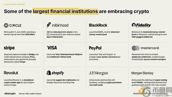 传统金融巨头(Visa、贝莱德、富达、摩根大通)与科技原生挑战者(PayPal、Stripe、Robinhood)纷纷推出加密产品;