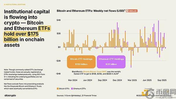 交易所交易产品成为机构投资的另一关键驱动力,目前链上加密资产持仓规模突破1750亿美元,较一年前的650亿美元飙升169%。
