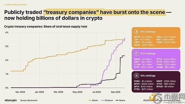 公开交易的"数字资产储备"公司——即在资产负债表中持有加密资产(类似企业国库持有现金的实体),目前合计持有流通中比特币和以太坊总量的约4%。这类数字资产储备公司与交易所交易产品现合计持有约10%的比特币和以太坊流通供应量。