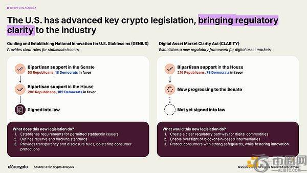 今年《GENIUS法案》的通过与《CLARITY法案》获众议院批准,标志着两党已达成共识:加密资产不仅将在美国存续,更已具备繁荣发展的条件。这两项法案共同构建起平衡创新与投资者保护的稳定币监管、市场结构和数字资产监督框架。与此同时,第14178号行政令废除了早前的反加密指令,并成立跨机构工作组以推动联邦数字资产政策现代化。