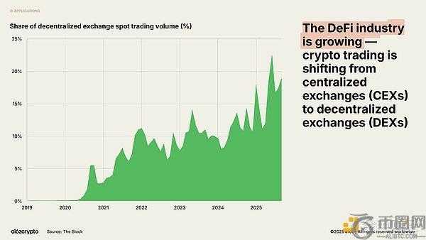 曾经仅是早期采用者小众试验场的链上经济,已演变为拥有数千万月活参与者的多元生态。如今近五分之一的现货交易量通过去中心化交易所完成。