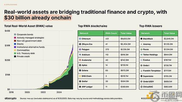 现实世界资产——包括美国国债、货币市场基金、私募信贷和房地产等以代币化形式呈现于链上的传统资产——正在连接加密与传统金融。代币化RWA总市场规模达300亿美元,过去两年增长近四倍。